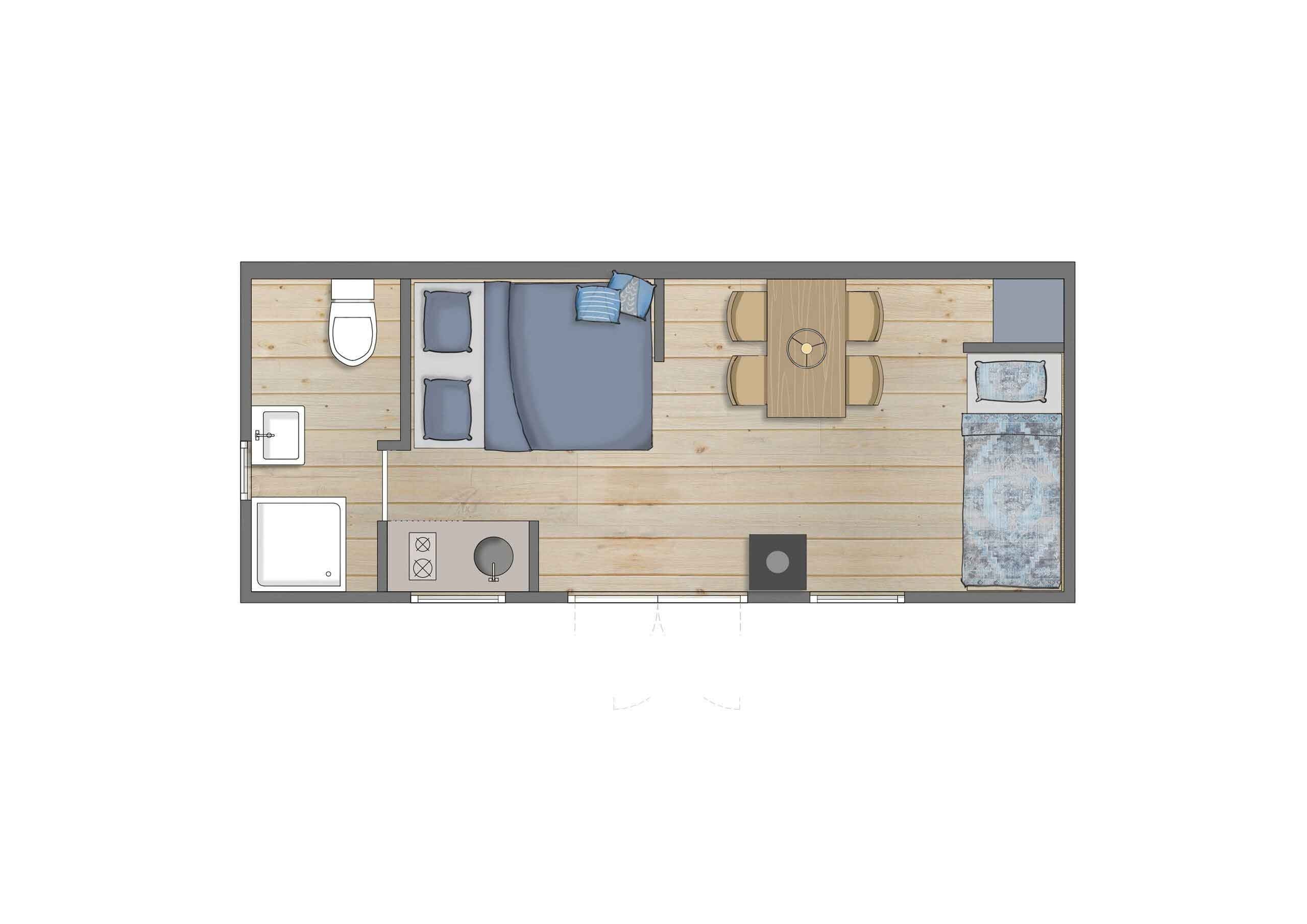 Die Polderlodge bietet alle Annehmlichkeiten in natürlicher Einfachheit: einen Wohnbereich mit Essecke, ein komfortables Doppelbett und ein Etagenbett. Die kompakte Küche ist unter anderem mit einem Kochfeld und einem Kühlschrank ausgestattet. Selbstverständlich verfügt die Polderlodge auch über ein Badezimmer mit Dusche und Toilette.