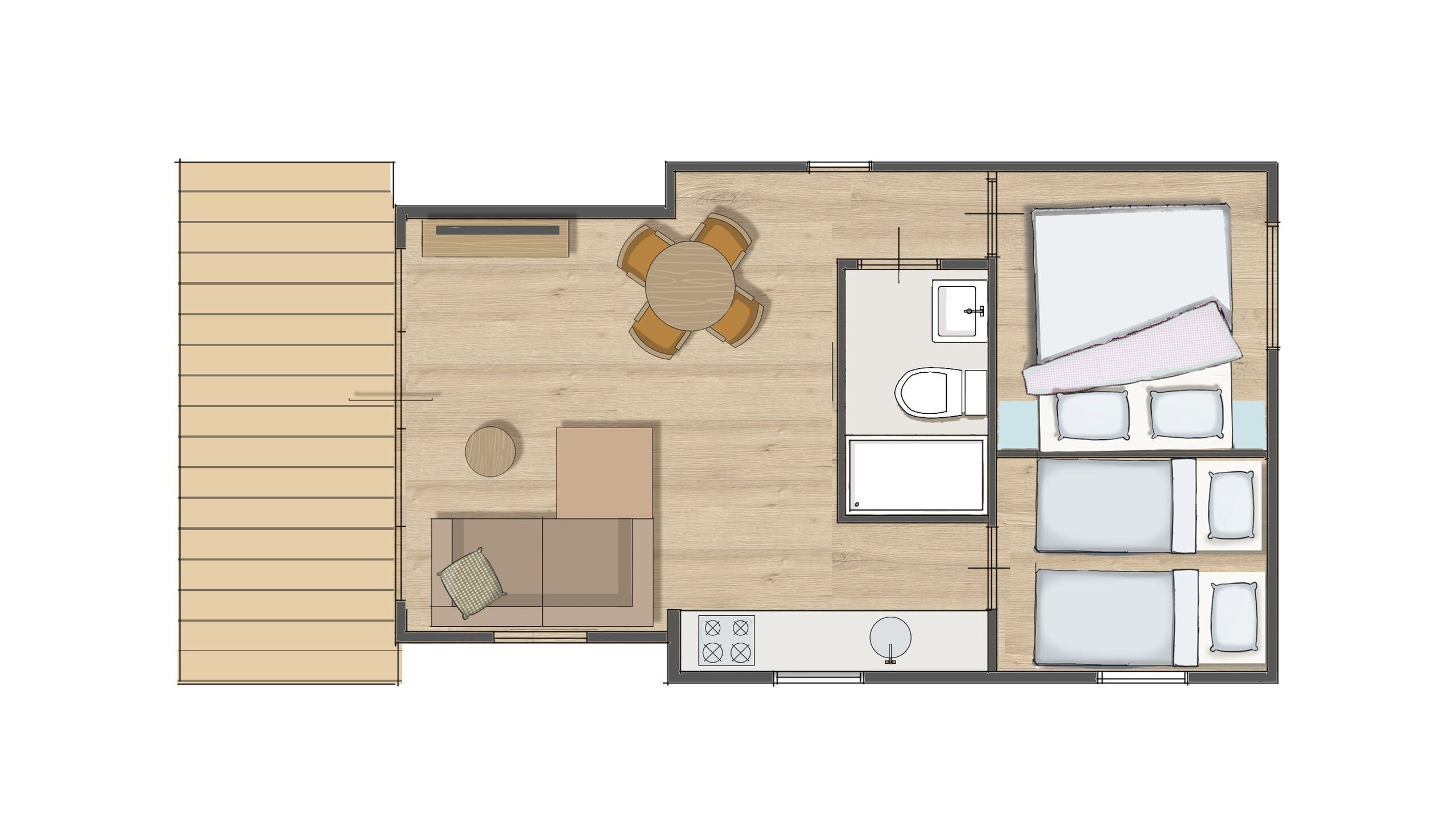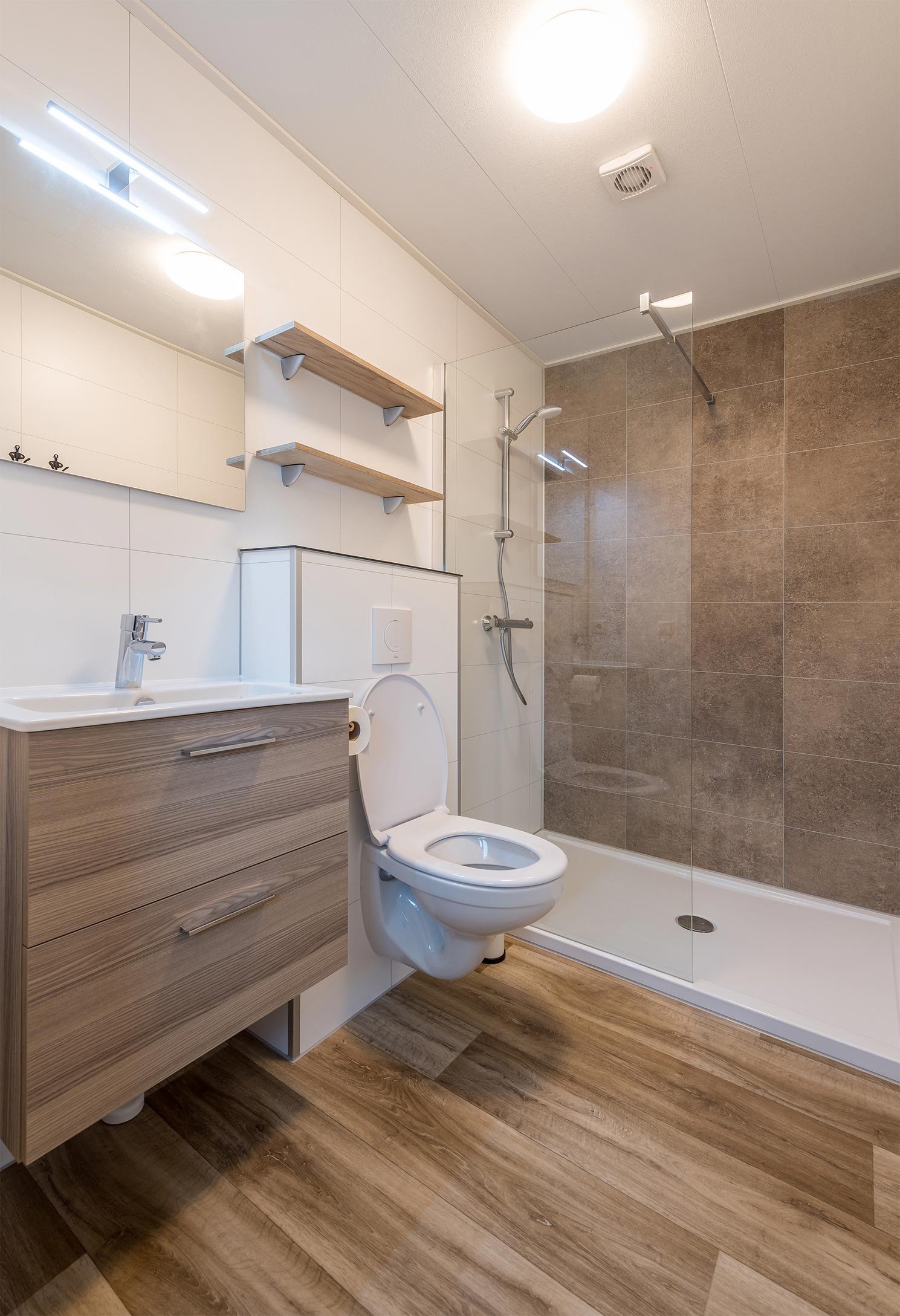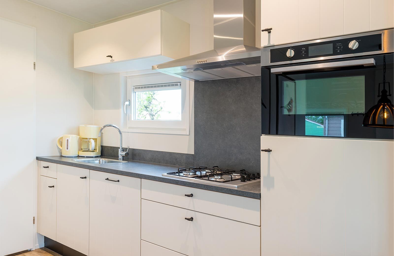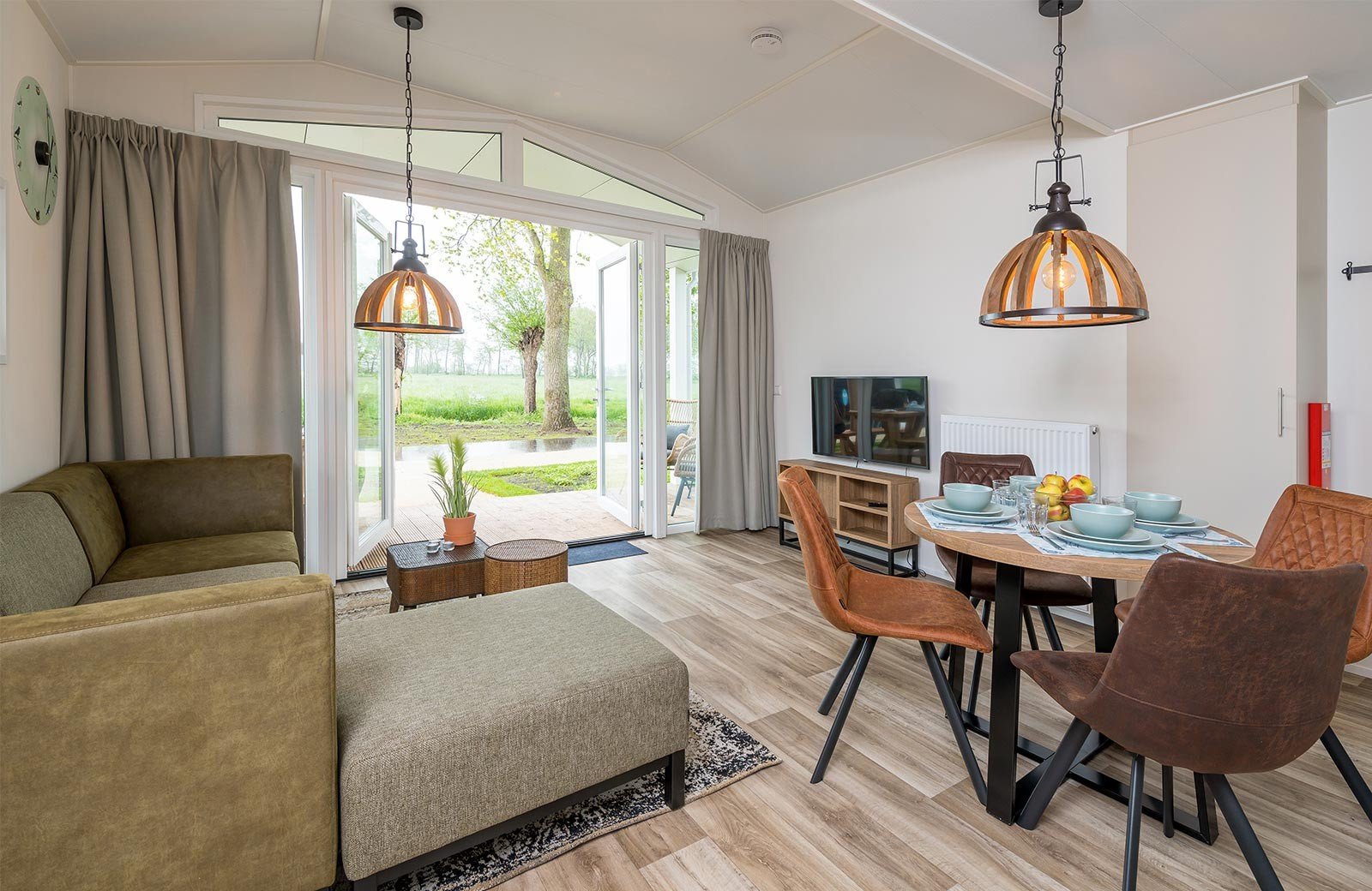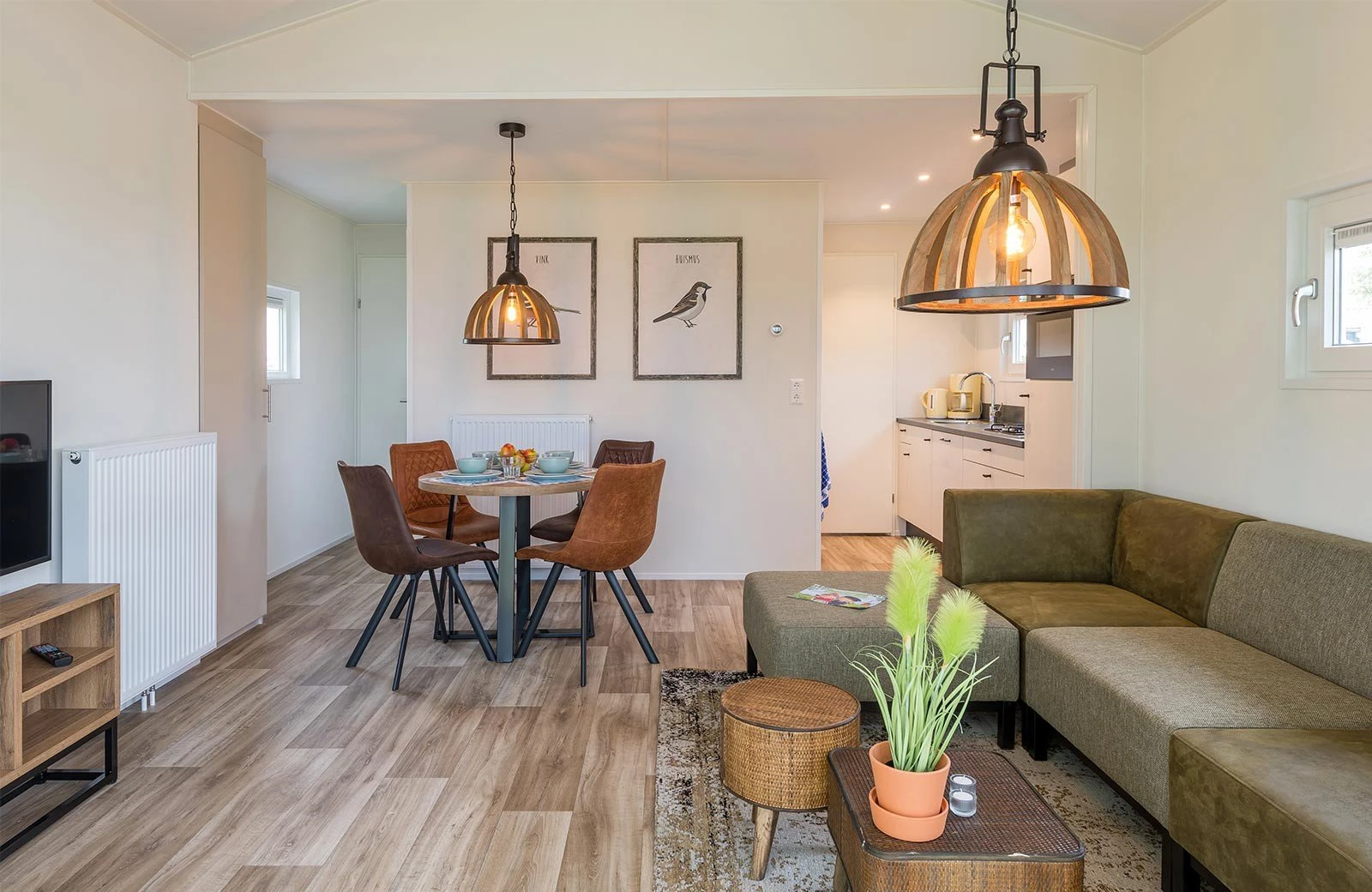 Das freistehende Biesboschchalet ist modern eingerichtet und verfügt über ein gemütliches Wohnzimmer mit Sitz- und Essecke. Die Küche ist ausgestattet mit u.A. einem Kühlschrank, Kochfeld, Wasserkocher, Geschirrspüler, einer Kaffeemaschine und Mikrowelle.