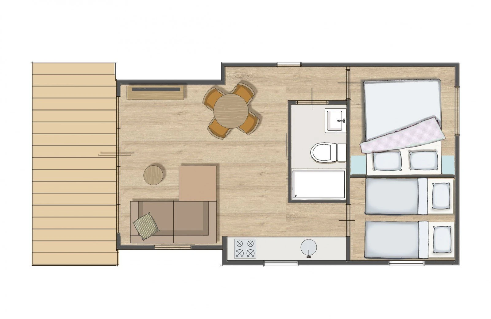 In den beiden geräumigen Schlafzimmern können Sie sich auf bequemen Boxspringbetten ausruhen. Natürlich verfügt das Biesbosch-Chalet auch über ein Badezimmer mit Dusche und Toilette.