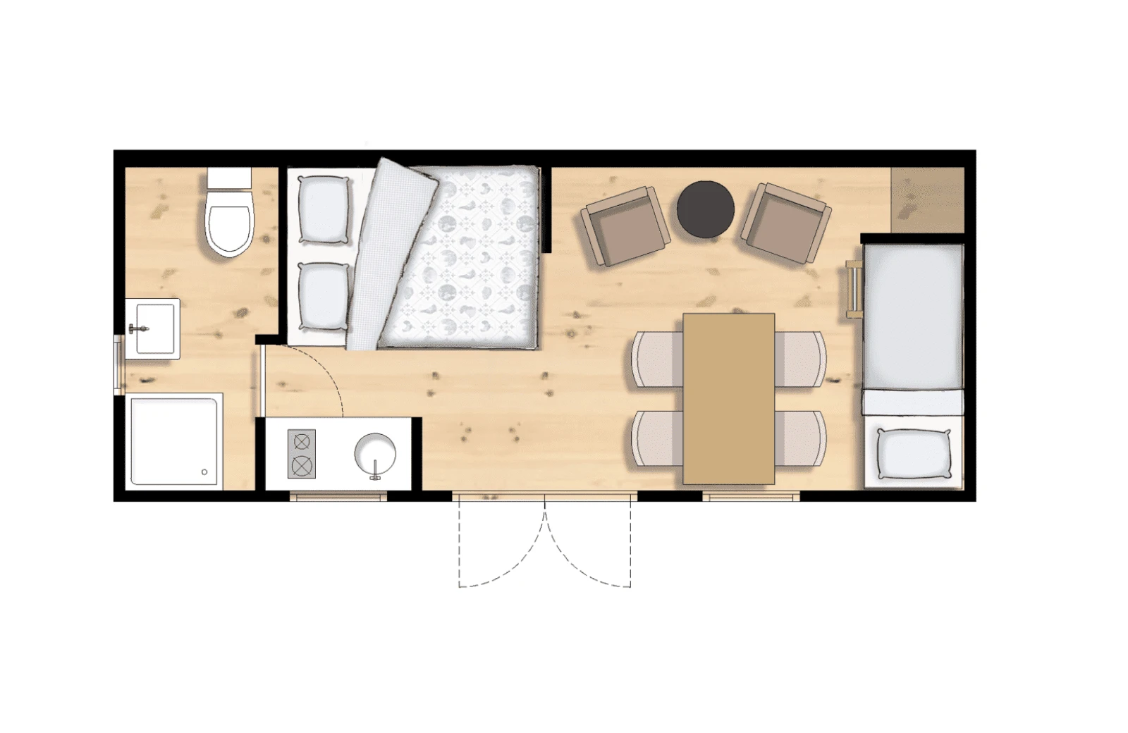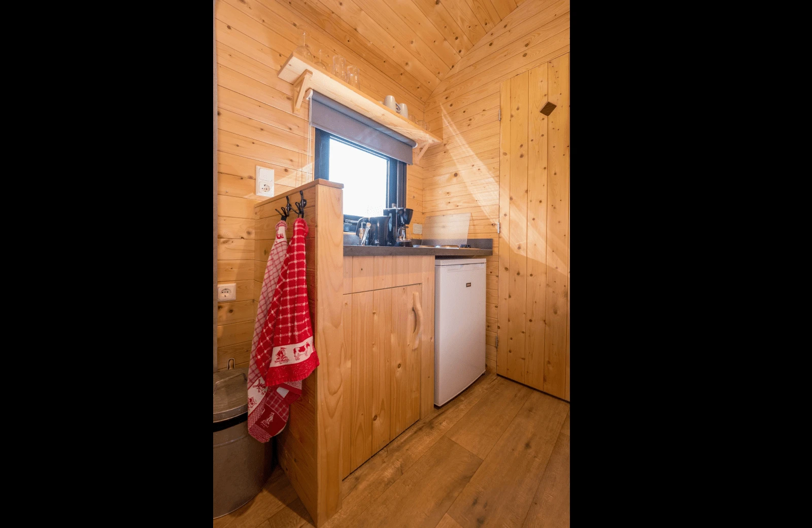 Die Polderlodge ist mit allen notwendigen Einrichtungen in natürlicher Einfachheit ausgestattet: einem Wohnbereich mit Essecke, einem bequemen Doppelbett und Etagenbetten. Die kompakte Küche ist unter anderem mit einer Kochplatte und einem Kühlschrank ausgestattet. Selbstverständlich verfügt die Polderlodge auch über ein Badezimmer mit Dusche und Toilette. Alle Polderlodges sind voll elektrisch. Das Wasser wird in allen Polder-Lodges mit einem Boiler erhitzt.